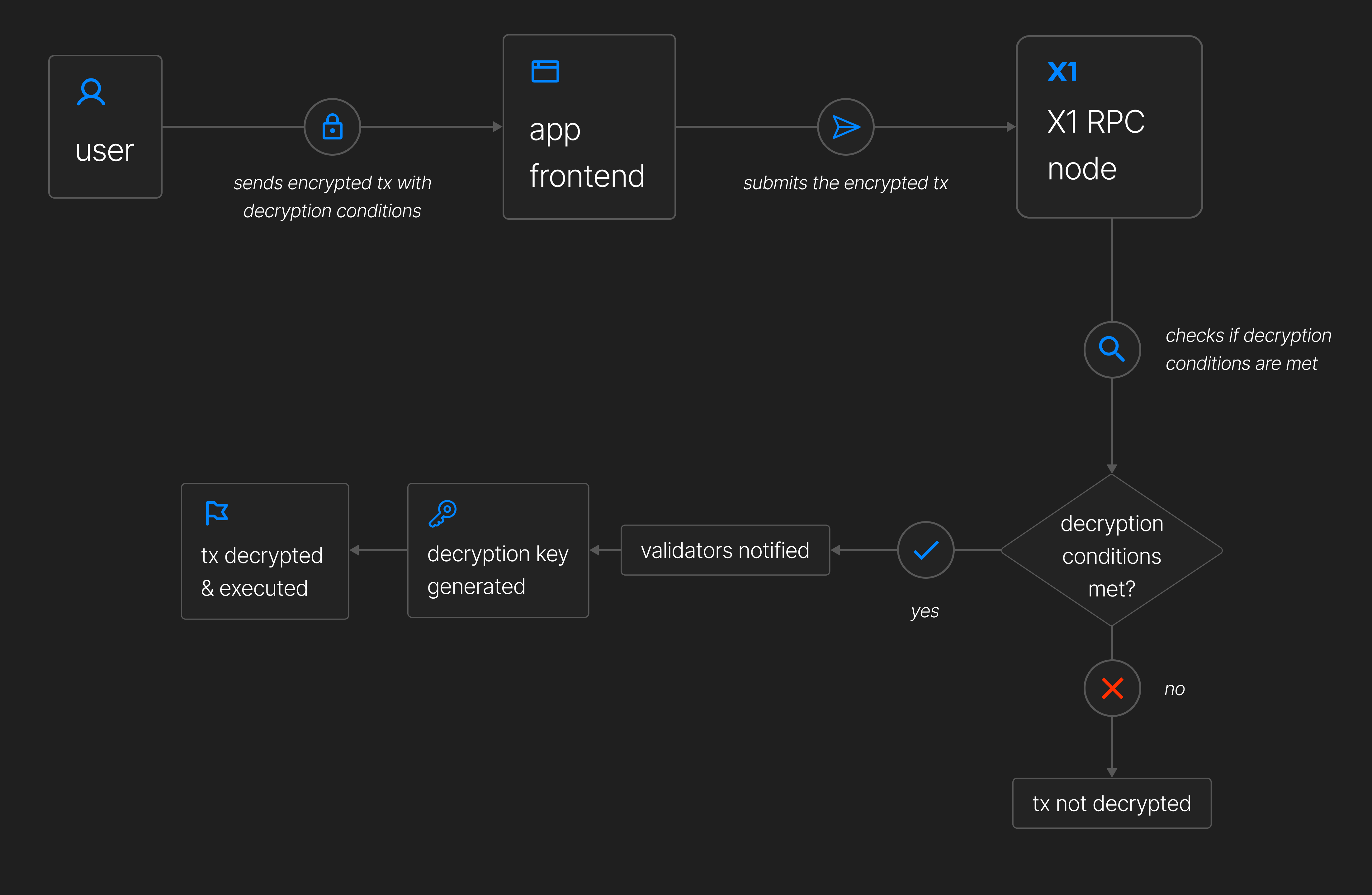 From any application frontend, a user can encrypt a transaction by declaring its condition for decryption. The encrypted transaction is then submitted to the network. Multiple transactions can be encrypted under the same conditions and decrypted in batches.